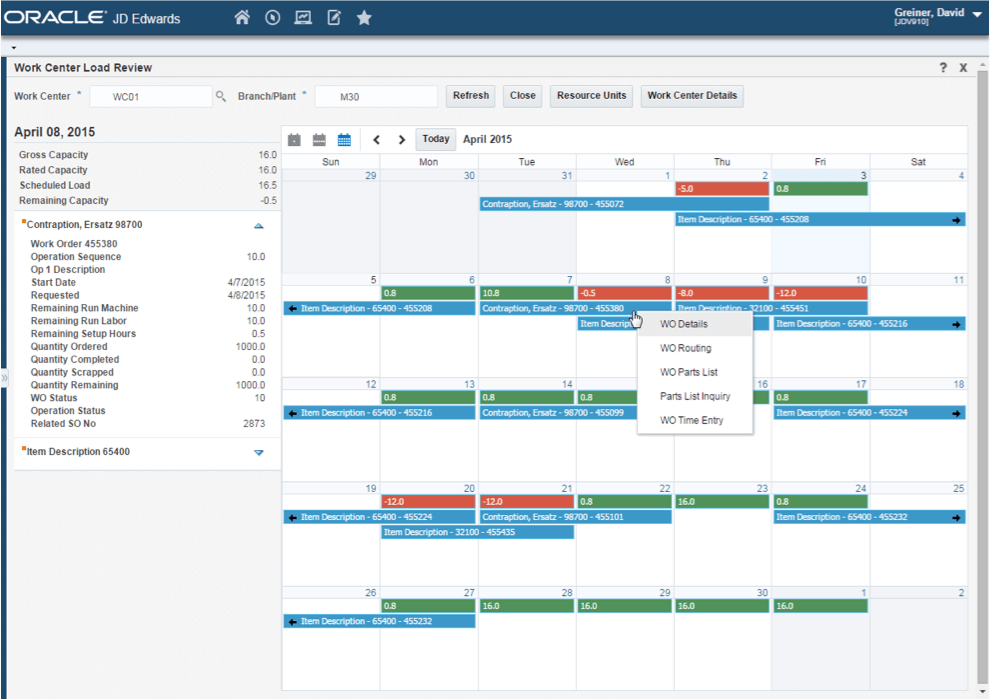 Production schedulers have increased abilities in JD Edwards Enterprise 9.2 to view Work Center Load visually in a calendar view. The calendar view makes it easy to view critical information and work center capacity as well as intuitively drill down into additional details to make schedule adjustments.